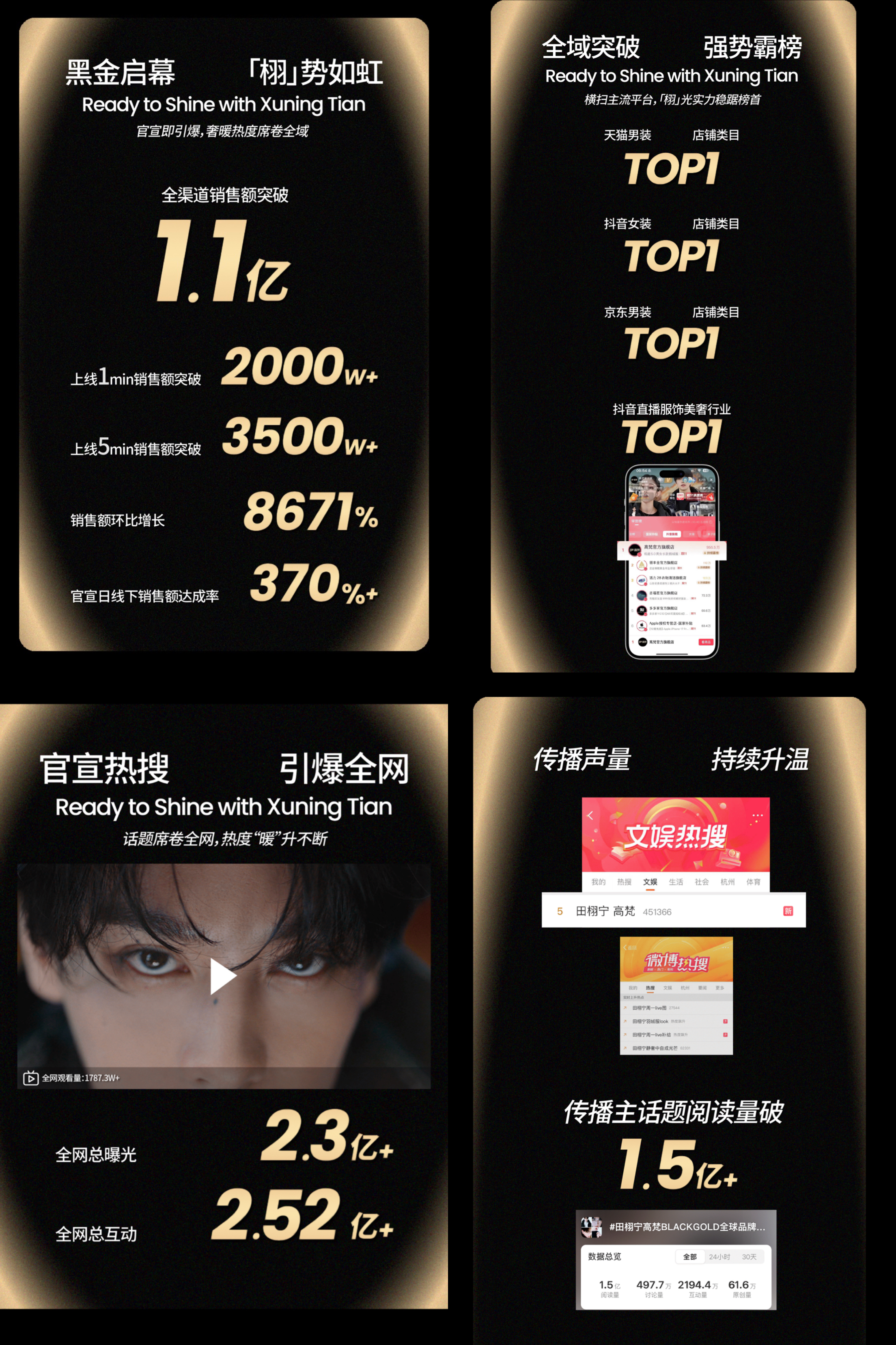 另一方面,高梵不断深化全渠道布局战略,兼具线下、线上乃至海外市场的持续拓展。线下,25年在北京、沈阳、湖南等地开设共计12家门店,入驻高端商场1层,9月高梵沈阳铁西万象汇首店启幕,开业首日营业额10万+;4城7家精品大店,多次单日销售破双位数万元;线上,从24年天猫双十一开卖仅四小时就突破亿元大关,全平台断层领先,到25年线上成功斩获2025天猫华服奖 “超级营销王” 荣誉。近日品牌官宣田栩宁为高梵BLACKGOLD全球品牌代言人,更是迅速冲上微博热搜,官旗、抖音店铺多款产品火速售罄,销售表现亮眼。高梵亦坚持品牌出海,积极开辟海外市场:24年登陆全球顶奢店王巴黎莎玛丽丹,并成为首个登陆巴黎时装周官方日程的中国鹅绒服品牌,不难看出,高梵正在逐步发展为国际高端市场的重要参与者。在全球维度下,高梵对标Moncler和加拿大鹅,前者以专业户外建立信任,后者主打极寒功能性;在这样的竞争格局下,高梵走出一条与众不同的“时尚户外风”差异化道路,在专业与审美之间找到平衡,构建起高端品质+全场景触达的竞争壁垒。